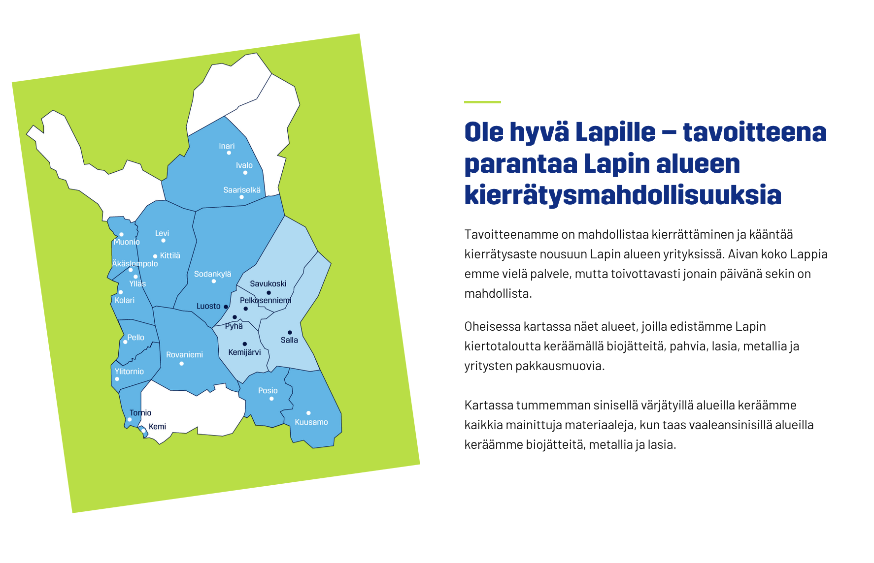 Oheisessa kartassa näet alueet, joilla edistämme Lapin kiertotaloutta keräämällä biojätteitä, pahvia, lasia, metallia ja yritysten pakkausmuovia.